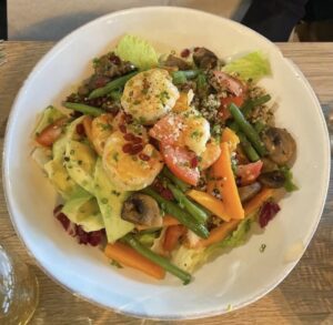 On y découvre la cuisine classique de la cantine healthy ou végétarienne pour bien manger : salade, pâtes, gambas et la variété des légumes du marché sont au rendez-vous avec des mariages de saveurs inhabituels toujours réalisés à la perfection, copieuses, gourmandes au bon rapport qualité prix!